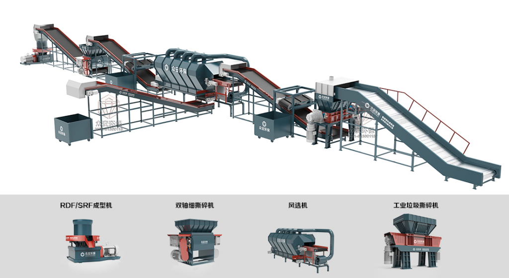 廢布料通過輸送機(jī)輸送至雙軸破碎機(jī),進(jìn)行粗破碎,減小物料體積,以方便后續(xù)處理;破碎后的物料進(jìn)入磁選機(jī),將鐵物質(zhì)分離出來回收;分離后廢布料繼續(xù)進(jìn)入粉碎機(jī),破碎成理想尺寸;細(xì)破碎后的物料通過RDF成型機(jī),擠壓成RDF高密度顆粒,作為燃料,供發(fā)電廠燃燒發(fā)電,為了避免在處理過程中造成的料破碎生產(chǎn)線特別適用于粉碎各類廢舊衣服、廢舊布料、機(jī)頭料、各類廢舊下腳料、各類廢舊邊角料、廢舊皮革、牛皮、纖維、舊鞋、地毯、棉被衣物及各類廢舊生活、辦公用品等。